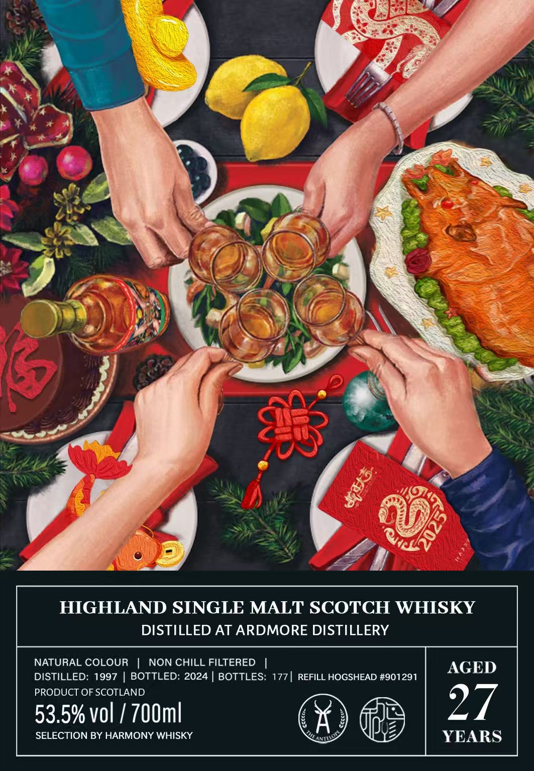 税込:48400円、送料:全国均一1000円。 アードモア 27年 1997-2024 リフィルホグスヘッド 53.5% アードモアらしい内陸ピートのスモーキーさとフルーティーさ、そして麦芽風味が合わさった通好みな1本。ただし注ぎたては酒質の粗さ、ホグスヘッドの華やかな要素と酒質由来の要素が混ざり合ってない印象を受けるが、グラスの中で時間をかけることで華やかでフルーティーでスモーキーな風味へと真価を発揮する。 グラスとの相性がはっきり分かれるようで、ボウル形状のグラスはいろいろな香味を開かせるためか、それらが混ざり合うまで少しちぐはぐな印象を持つ場合もある。ストレートな形状のスピリッツグラスのほうが、注ぎたてから内陸ピートのスモーキーさと柑橘系統のフレーバーを楽しめる。
